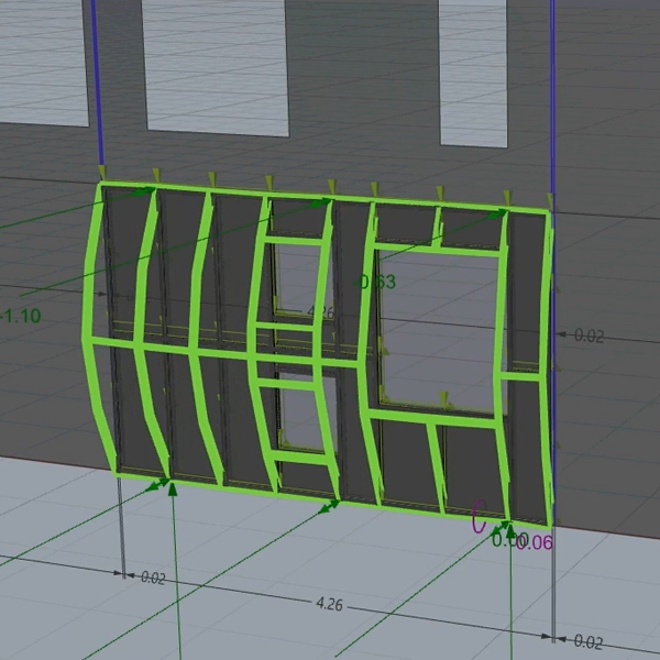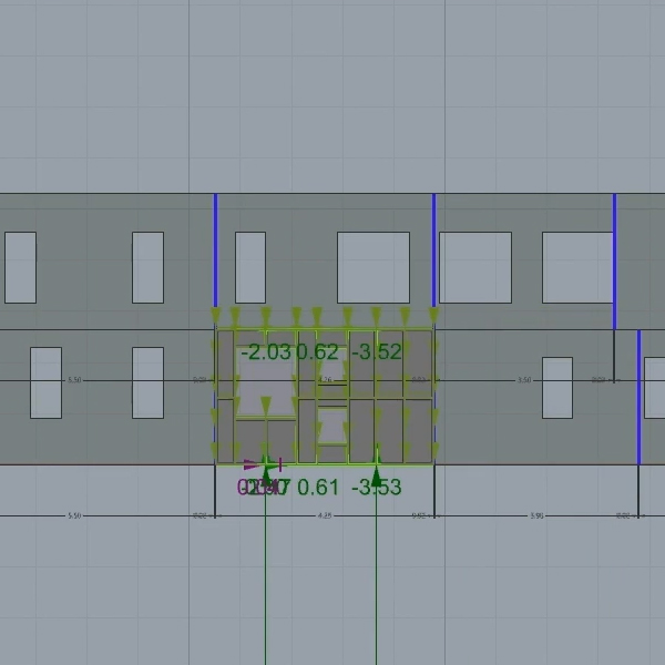 • La réalisation d’un scan de façade et sa modélisation permet d’avoir la première donnée d’entrée en tenant compte de l’enveloppe réelle du bâtiment avec les baies, éléments saillants, bords ainsi que des ajustements d’aplomb, de niveau et de nu.